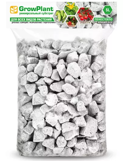 Cубстрат GrowPlant пеностекольный песок фракции 20-30 предназначен для улучшения почвы на грядках для аэрации и отличного дренажа. Применяется при составлении смесей для горшечных растений, отличная мульча для верхнего слоя и борьбы с мушками, грибными комарами (среда неблагоприятная для их развития)