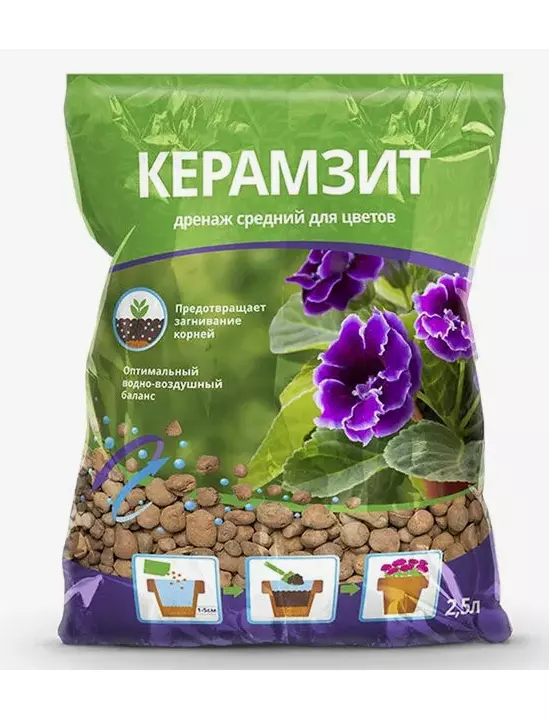 Дренаж керамзитный предназначен для улучшения оттока излишков воды из горшков и обеспечивает доступ воздуха к корням.