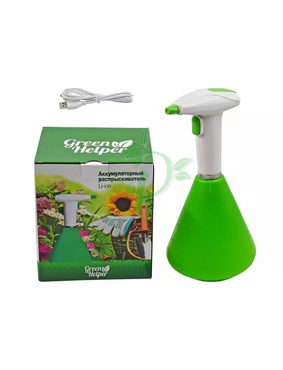 Опрыскиватель Green Helper GS-001 заряжается от USB. Пульверизатор объемом 1 литр оборудован мембранным насосом, который подает жидкость из сопла при нажатии на регулятор.
