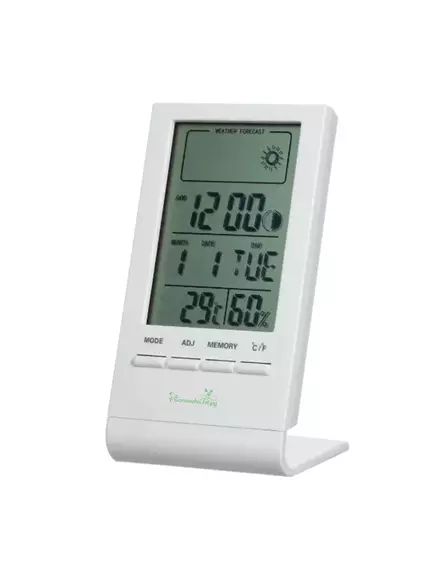 Термометр гигрометр электронный цифровой CX-220 белый, домашняя метеостанция. Погодная станция предназначена для круглосуточного измерения температуры и влажности воздуха во внутренних помещениях дома, в офисе. В верхней графе циферблата отражается смайлы комфортности, в средней графе текущее время, далее календарь на год и день недели. В нижней графе отображаются температура и влажность от встроенного в термометр датчика. Выносного датчика конструкцией не предусмотрено. Пределы измерений температуры от -50 до 70 С, погрешность 1 градус, влажность от 10 до 99, погрешность 5 процентов. Разрешение 0,1 С и 1 процент. Питание от 1 батарейки AG10, есть в комплекте. Дополнительно есть запоминание максимальной и минимальной температуры и влажности, измерение в C или в F, будильник. Дисплей без подсветки. Четыре кнопки управления. Установка на ровную поверхность при помощи съемной ножки. Размер 9,5 х 5,5 х 1,4 см, вес 60 г. Размер упаковки 10,5 х 6 х 2,3 см, вес 75 г. Сделано в Китае.