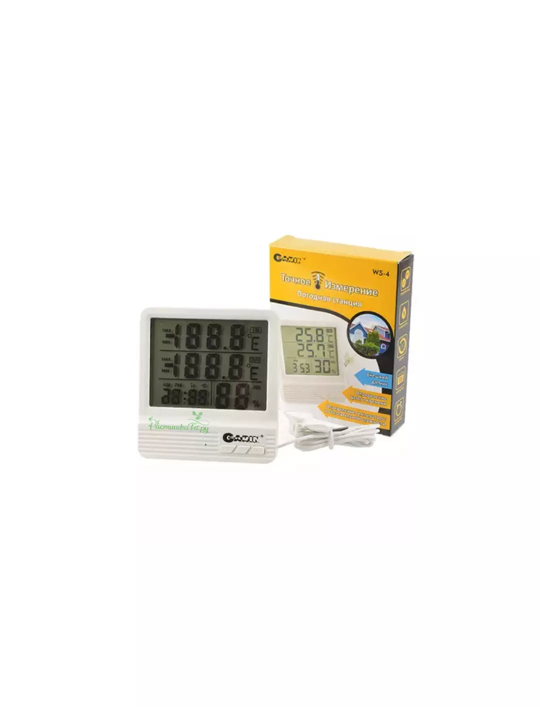 Термометр погодная станция GARIN WS-4 Точное Измерение определяет влажность и температуру воздуха в помещении и на улице, благодаря выносному датчику. У прибора есть функции даты, времени, а также встроенный будильник. Устройство имеет внутреннюю память и может запоминать максимальные и минимальные значения влажности и температуры. Показатели измерения отображаются на большом дисплее крупными цифрами.