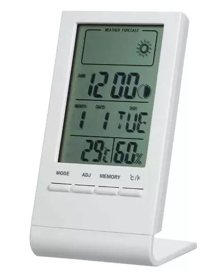 Термометр гигрометр электронный цифровой CX-220 белый, домашняя метеостанция. Погодная станция предназначена для круглосуточного измерения температуры и влажности воздуха во внутренних помещениях дома, в офисе. В верхней графе циферблата отражается смайлы комфортности, в средней графе текущее время, далее календарь на год и день недели. В нижней графе отображаются температура и влажность от встроенного в термометр датчика. Выносного датчика конструкцией не предусмотрено. Пределы измерений температуры от -50 до 70 С, погрешность 1 градус, влажность от 10 до 99, погрешность 5 процентов. Разрешение 0,1 С и 1 процент. Питание от 1 батарейки AG10, есть в комплекте. Дополнительно есть запоминание максимальной и минимальной температуры и влажности, измерение в C или в F, будильник. Дисплей без подсветки. Четыре кнопки управления. Установка на ровную поверхность при помощи съемной ножки. Размер 9,5 х 5,5 х 1,4 см, вес 60 г. Размер упаковки 10,5 х 6 х 2,3 см, вес 75 г. Сделано в Китае.