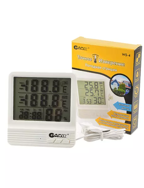 Термометр погодная станция GARIN WS-4 Точное Измерение определяет влажность и температуру воздуха в помещении и на улице, благодаря выносному датчику. У прибора есть функции даты, времени, а также встроенный будильник. Устройство имеет внутреннюю память и может запоминать максимальные и минимальные значения влажности и температуры. Показатели измерения отображаются на большом дисплее крупными цифрами.