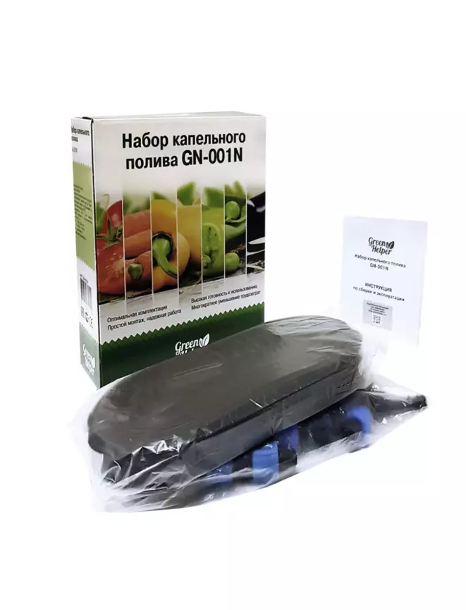 Комплект капельной системы полива GN-001N предназначен для организации автоматического полива в теплице размером 4х6 метров. В комплект входят все необходимые элементы для подключения системы к емкости с водой и установки на грядках.