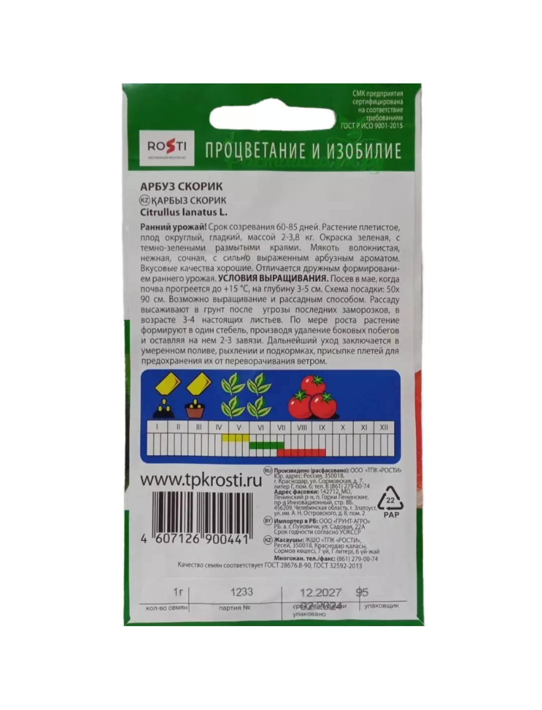 Ранний урожай. Срок созревания 60-85 дней. Растение плетистое, плод округлый, гладкий, массой 2-3,8 кг. Окраска зелёная с темно-зелеными размытыми краями. Мякоть волокнистая, нежная, сочная с сильно-выраженным арбузным ароматом. Вкусовые качества хорошие. Отличается дружным формированием раннего урожая.