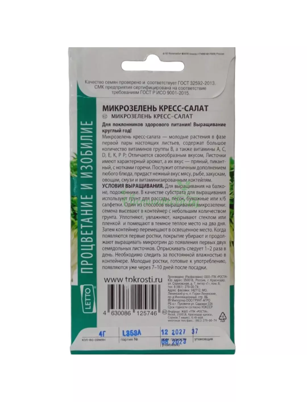 Микрозелень кресс-салата – молодые растения в фазе первой пары настоящих листьев, содержат большое количество витаминов группы B, а также витамины A, C, D, E, K, P P; Отличается своеобразным вкусом, Листочки имеют характерный аромат, а их вкус – пряный, пикантный, с нотками горечи. Послужит отличным дополнением любого блюда, придаст нежный вкус мясу, рыбе, закускам, овощам, смузи и витаминизированным коктейлям. Предназначена для выращивания на балконе, подоконнике.