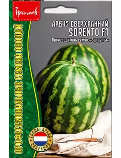 Высокоурожайный, сверхранний (от высадки рассады до созревания 55-60 дней) гибрид. Выращивают растение как в теплице, так и в открытом грунте. Рост арбуза осуществляется умеренно, плети в основном имеют среднюю длину. Показывает устойчивый иммунитет к антракнозу. Растение среднеплетистое, формирует по 2-3 плода одновременно, масса которых в зрелом виде доходит до 9 кг. Плод округлой формы, тёмно-зелёного цвета со светлыми полосами. Оттенок мякоти варьируется от светло-красного до бордового. Семена мелкие. Содержание сахара в плодах высокое. Плоды обладают хорошей транспортабельностью. При соблюдении условий хранения полностью сохраняют все свои вкусовые качества. Данный сорт предназначен для употребления в свежем виде. Однако из-за высокого содержания сахаров в мякоти арбуз может быть использован и для приготовления различных видов сладких заготовок.