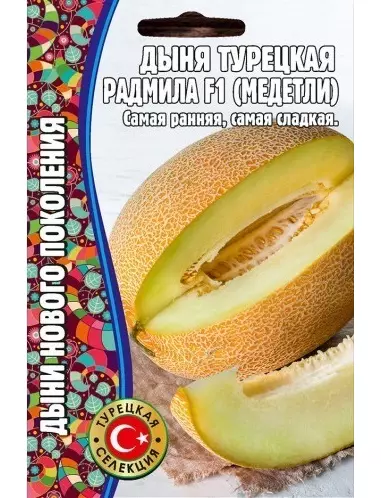 Этот превосходный сверхранний гибрид турецких селекционеров порадует вас изумительным вкусом своих плодов. На одном растении формируется 5- 6 привлекательных овальных дынь весом около 2 кг. Плоды однородные, выровненные по форме и размеру, желтого цвета, с очень привлекательной сеткой – эти качества сохраняются на всем протяжении вегетации. Мякоть очень сладкая, ароматная, плотная.