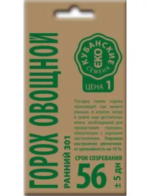 Раннеспелый. Лущильный. Период от полных всходов до цветения - 29-38 дней, до технической спелости - 60-64, до созревания - 68-75 дней. Боб прямой или слабоизогнутый, с тупой верхушкой, в фазе технической спелости темнозеленый, длиной 6-8 см, шириной 1,2-1,4 см, семян в бобе 5-7.Вкусовые качества хорошие. Созревание бобов дружное. Рекомендуется для консервирования, потребления в свежем виде и в домашней кулинарии.