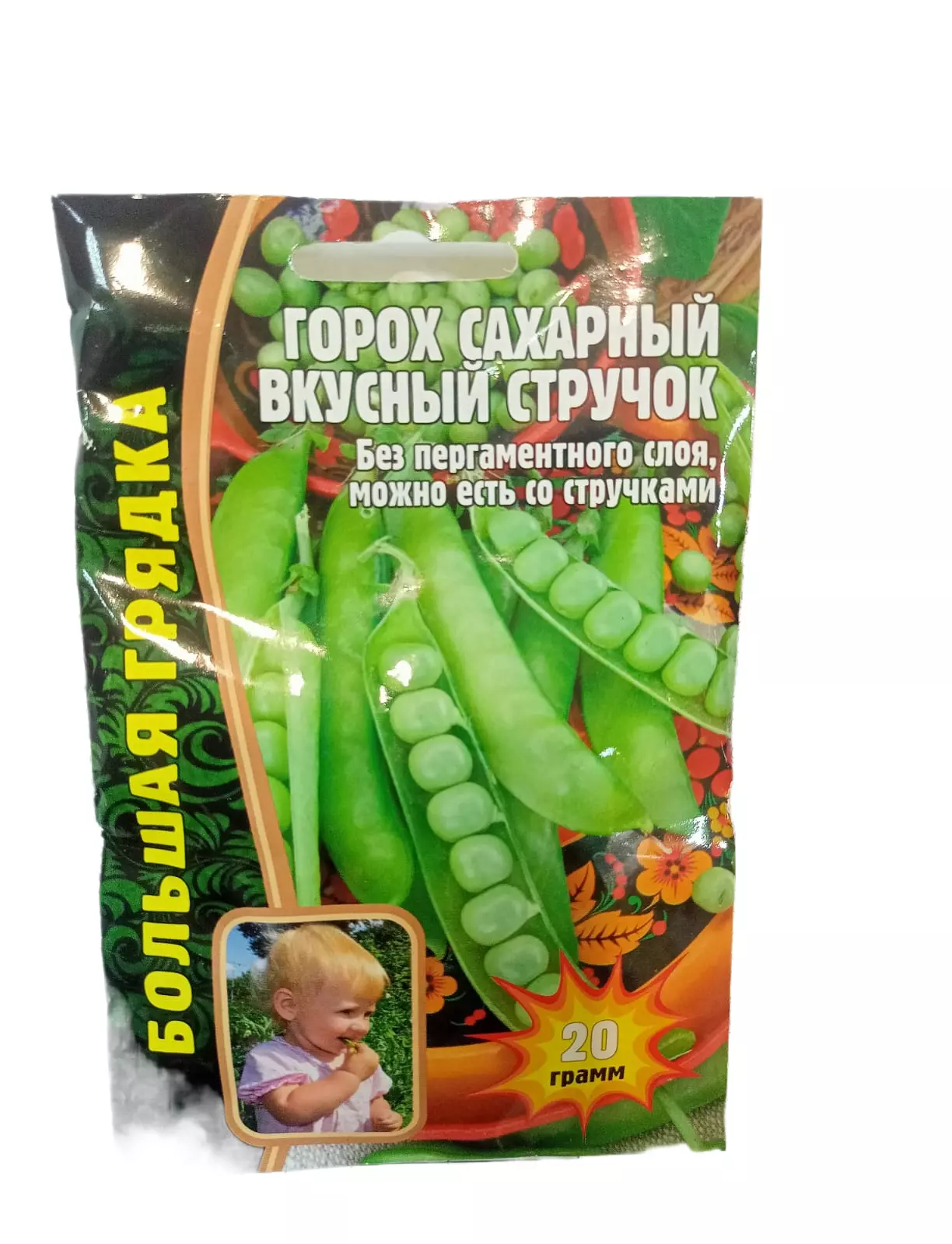 Горох вкусный стручок – любимое лакомство детей, представляющее собой раннеспелый сорт (40-45 дней от всходов до первого сбора). Это сахарный сорт, с высоким стеблем (50-70см), длинными, широкими, слабоизогнутыми бобами, мясистыми, без пергаментного слоя. Он прекрасно подходит для употребления в свежем виде, а также для кулинарной переработки, заморозки и консервации.
