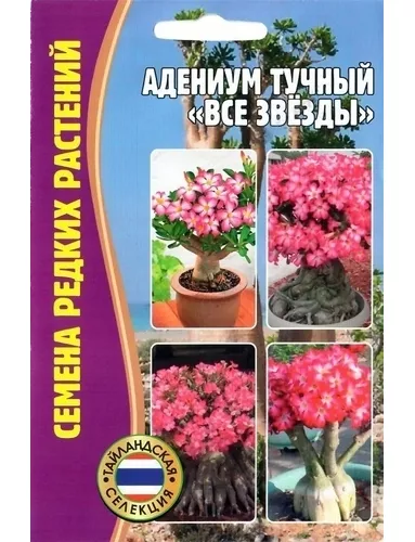 Адениум тучный «Все звёзды » Адениум тучный относится к долгожителям. У нас выращивается как комнатное. Цветет Адениум в основном с весны по осень. При соблюдении оптимальных условий выращивания может цвести почти круглогодично. Существуют экземпляры, возраст которых насчитывается более 75 лет. По утверждению разводчиков, эти растения способны жить до 200 лет, переходя из поколения к поколению.