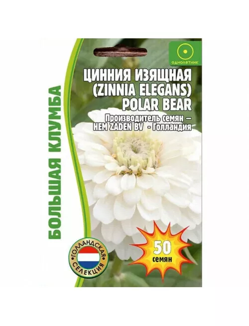 Свето - и теплолюбивое быстрорастущее растение высотой 80-90 см. Крупные махровые соцветия до 15 см в диаметре имеют чисто белую окраску. Цветение начинается через 80-90 дней после появления 3 всходов. Цветёт обильно и продолжительно. Используют для украшения клумб и рабаток, при создании сборных и монокультурных цветников, группами на газоне. Срезанные цветы долго стоят в воде.