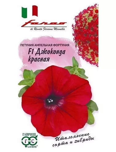 Уникальные гибриды итальянской серии «Джоконда» формируют поразительно мощный каскад из зелени и огромного количества цветов. Они превосходят все известные каскадные формы по многим параметрам, включая «сурфинию». Одно растение обладает такой скоростью и силой роста, что быстро заполнит пространство диаметром 1м. Цветение настолько обильное, что практически не видно зелени и количество цветков не меняется с начала цветения до заморозков. Габитус растения зависит от плотности посадки. При высадке на расстоянии 30см, растут, в основном, вверх, образуя «подушку» из красных цветков высотой 20см. Крепкие стебли позволяют поддерживать форму в течение всего сезона. Высаженные на расстоянии 60см, разрастается как почвопокровные во всех направлениях на площади 1м2. Но эффектнее всего выглядят растения в подвесных корзинах и балконных ящиках, где мощные многочисленные побеги длиной 80-100см, свисая, образуют грандиозный цветущий водопад. Выращивают рассадным способом.