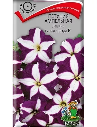 Новая модная группа ампельных петуний! Молодые растения прямостоячие; вырастая, побеги свешиваются и образуют лавину из цветов. Эффектные сине-фиолетовые воронковидные цветы с контрастной белой звездой в центре. Цветёт обильно с июня по октябрь. Великолепно подходит для подвесных корзин, балконных ящиков.