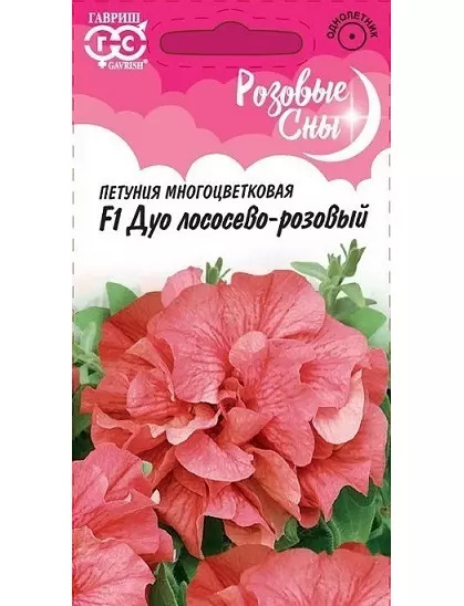 Многоцветковая махровая серия, очень рано всупает в цветение. Роскошное однолетнее растение с высокой устойчивостью к неблагоприятным погодным условиям. Эта гибридная форма петунии имеет объемный компактный и ветвистый кустик высотой 25-35см и диаметром 25-30см. Цветки лососево-розовые рисунком, многочисленные, до 5-5,5см в диаметре.