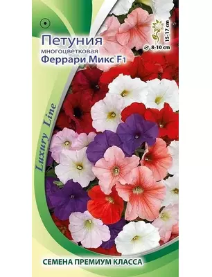 Супер полу-ампельная серия петунии Феррари! Формирует новые цветоносные побеги в середине куста, не оставляя пустот (это происходит с обычными ампельными петуниями). Растения высотой 15-17см, ветвистые, ширина куста 50-60см, все очень плотно усыпаны цветками, цветёт пышно весь сезон. Цветки крупные 8-10см в диаметре, очень яркие. Прекрасно сохраняют свою декоративность под воздействием дождя и ветра. Обильное, длительное цветение и неприхотливость позволяет использовать петунии во всех видах цветочного озеленения: для оформления бордюров, украшения балконов, при создании композиций на клумбах, в подвесных корзинах и кашпо.