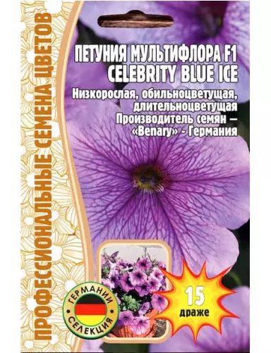 Прекрасный низкорослый обильноцветущий гибрид знаменитой немецкой фирмы ВЕNARY. Высота взрослых растений 15-25 см. Многоцветковая длительноцветущая петуния Селебрити, характеризующаяся выровненным габитусом, обилием ярких крупных цветов, диаметром 7-8 см, и устойчивостью к неблагоприятным погодным условиям. Петунии серии Селебрити отличаются высокой устойчивостью к дождю, ветру, к засушливой жаркой погоде. Цветы не выгорают, не теряют декоративности, быстро восстанавливаются после повреждений устойчива и способна к быстрой регенерации в неблагооприятных погодных условиях,