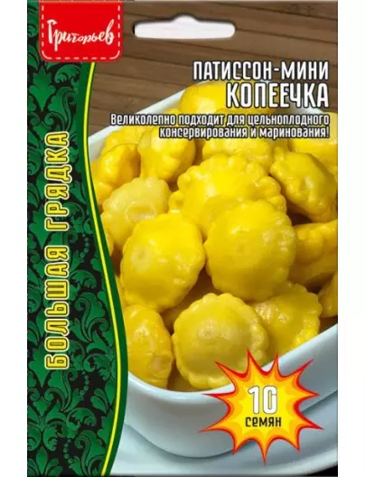 Новый ультраскороспелый (от всходов до созревания 35-38 дней), мелкоплодный сорт. Растения кустовые, преимущественно женского типа цветения, одновременно формируют огромное количество завязей. Плоды жёлто-оранжевого цвета, массой 15-25 г. Мякоть кремовая, плотная, хрустящая и очень нежная. Плоды используются для цельноплодного консервирования и маринования, а так же для домашней кулинарии (тушения, жарки), заморозки.