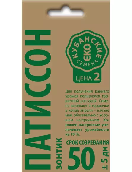 Раннеспелый сорт. Период от полных всходов до первого сбора 40-55 дней. Растение кустовое. Плод чашевидный с зубчатыми краями, массой 0,7-1,5 кг. Поверхность гладкая, белесая или светло-зеленая. Мякоть белая, плотная. Вкус хороший и отличный. Используют молодые плоды, когда мякоть нежная и семена не развиты. Универсальное использование. Для консервирования рекомендуется убирать при диаметре 8 см.