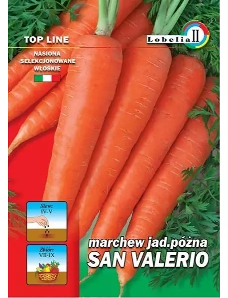 Морковь САН ВАЛЕРИО длинноконусный сорт корень до 25 см, окраска оранжевая характеризуется с высоким содержанием бета-каротина. Он также выделяется отличные вкусовые качества Подходит для непосредственного употребления Устойчив к перерастанию и растрескиванию После сбора урожая подходит для кратковременного хранения сои Посев с апреля к концу мая, блат с начала июля до конца сентября.