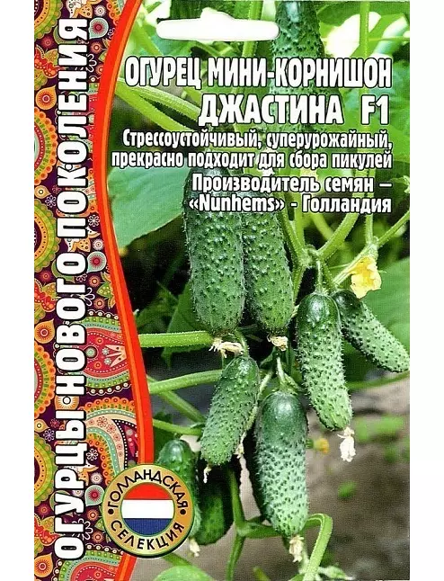 Джастина F1 — гибридный сорт с ранними первыми сроками отдачи урожая. Плодоношение начинается через 37-40дней от всходов. Одновременно на кусте образуется до 14 однородных плодов, длиной 6-8см., массой 60-80г. Огурчики темно-зелёной окраской, хрустящие, сочные.