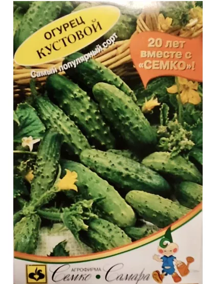 Скороспелый. Пчелоопыляемый. В плодоношение вступает на 49-й день после массовых всходов. Главная плеть короткая (35-60 см), растение имеет кустовую форму с боковыми побегами первого порядка. Лист зеленый, сердцевидно-лопастной формы, со слаборассеченной пластикой. Лопасти у основания листа не соприкасаются. Зеленец удлиненно-яйцевидной формы, с бугорчатой поверхностью. Бугорки редкие. В поперечном разрезе зеленец округло-трехгранный. Длина 9-12 см, масса 120-136 г. Вкусовые качества свежих и консервированных огурцов хорошие.