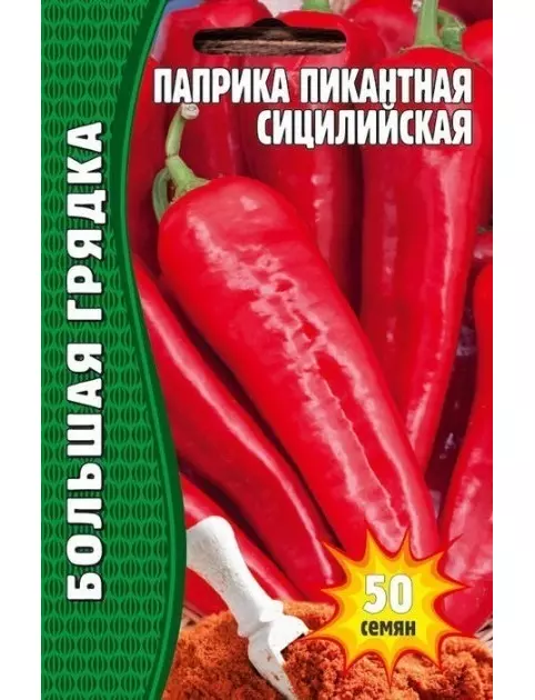Это высокоурожайный среднеспелый сорт для открытого грунта и плёночных теплиц. Период от всходов до начала созревания плодов 120-130дней. Куст высотой 50-60см., плоды слабоморщинистые, имеют конусовидную форму. На одном кусте созревает до 60плодов. Окраска в технической спелости зеленая, в биологической - красная. Длина 20-35см, диаметр 1-1,5см. Масса 25-35г. Используют как приправу к блюдам, в качестве специй при квашении, мариновании и консервировании. При консервировании семена не удаляют. Из паприки делают знаменитую приправу с аналогичным названием. Для этого плоды хорошо высушивают и перемалывают. Из данного сорта получается паприка со слабоострым пикантным вкусом.
