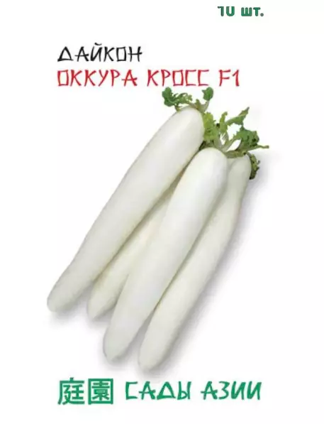 Дайкон Окура Крос - это уникальный гибрид японского происхождения, который не склонен к цветушности и имеет крупные плоды цилиндрической формы. Кожица белая, а мякоть сочная и с ощущаемой горчинкой, что делает его идеальным выбором для любителей хрустящих овощей. Техническая спелость наступает на 60-70 дней от появления всходов. Урожайность может достигать до 40-42 см, а диаметр - 6 см,