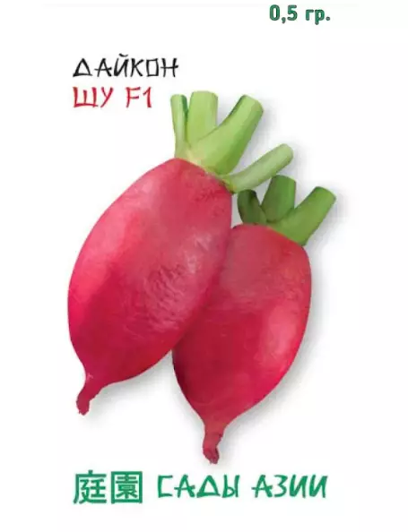 Дайкон Шу - в поле долгое время не трескается. Среднеранний гибридный сорт (60-70 дней). Плод имеет красную кожуру и белую мякоть- сладкая, сочная и без горечи, очень вкусная, однородную по форме и превосходного качества. Он также устойчив к ложной мучнистой росе (пероноспороз) и вирусу репчатого лукового мозаики (PLRV).