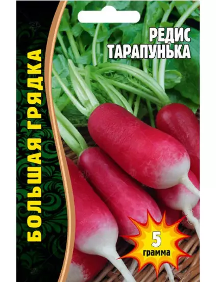 Редис Тарапунька - ультраранний (16-20 дней от всходов до технической спелости) сорт. Цвет корнеплода варьируется от розовато-красного до ярко-красного с белым кончиком. Форма — овально-цилиндрическая. Длина корнеплода достигает 8 см. Вес плода составляет 20-25 г. На одном участке земли за весенне-летний сезон можно получить до 4 урожаев этого корнеплода. Первый посев осуществляется сразу, как только сходит снег. Последующие - с интервалом не менее 2 недель. Последний посев производят в середине августа. Редис 18 дней характеризуется хорошей лежкостью. Для зимнего хранения подходят корнеплоды, выращенные с середины августа до конца сентября.