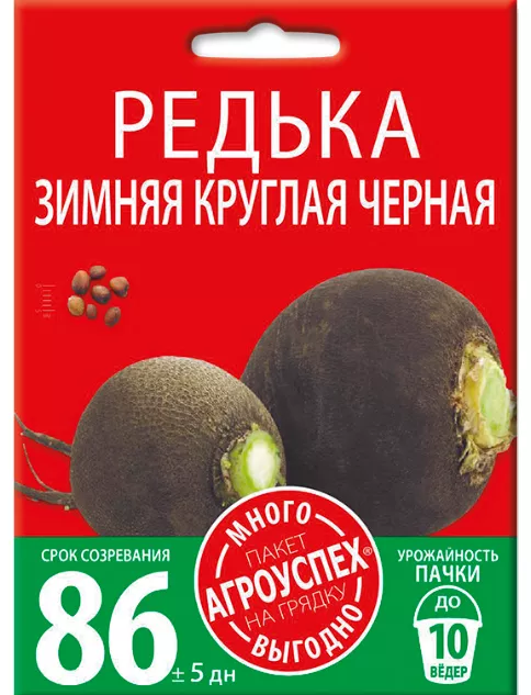 Среднеспелый сорт (80-90 дней от полных всходов до технической спелости). Один из лучших по вкусовым и лекарственным свойствам среди зимних сортов. Корнеплод черный, плоскоокруглый или округлый, поверхность гладкая, иногда слегка бороздчатая, мякоть белая, плотная, сочная, остро-сладкого вкуса, в почву погружен полностью. Масса корнеплода 250-550 г. Отличается высокой лежкостью в период зимнего хранения.
