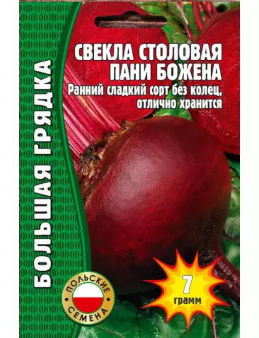 Ранний сладкий сорт без колец, отлично хранится. Свекла Пани Божена порадует вас стабильным урожаем выровненных сладких корнеплодов. Раннеспелый сорт. Период от всходов до уборки урожая 80-100 дней. Корнеплод округлый, среднего размера, темно-красный, гладкий, мякоть темно-красная, без внутренних колец. Масса корнеплода 200-300 г. Вкусовые качества отличные. Сорт устойчив к стрелкованию. Рекомендуется для летнего потребления и хранения.