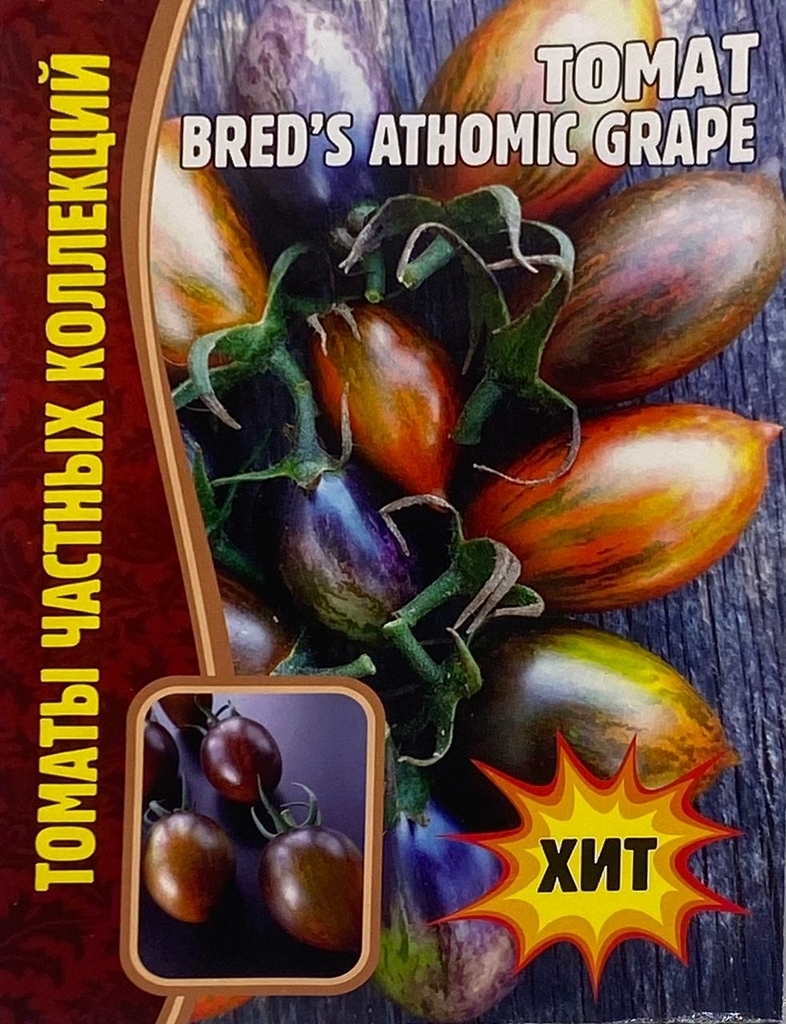 Американский сорт "Атомный виноград (гроздь) Брэда" (Brad’s Atomic Grape). Сорт индетерминантный, среднеранний, урожайный, некрупный, короткие сложные кисти напоминают грозди винограда. Стебли средней толщины, формировать лучше в 3-4 стебля. Плод «сливка» 40- 50 г, фиолетовое пятно растекающейся лавой обволакивает плод, оттенки лавандового и пурпурного полос, созревая, превращаются в красно-коричневые с антоциановыми полосами. На срезе плод жёлто-зелёный с красными мазками, нежно-сладкий, с кисти не осыпается, хорошо хранится после сбора урожая. Универсальный. Но вяленый - это точно сухофрукт. Сорт, как застывшая эмоция, он производит неизгладимое впечатление. Чувство восторга, не покинет вас до конца сезона