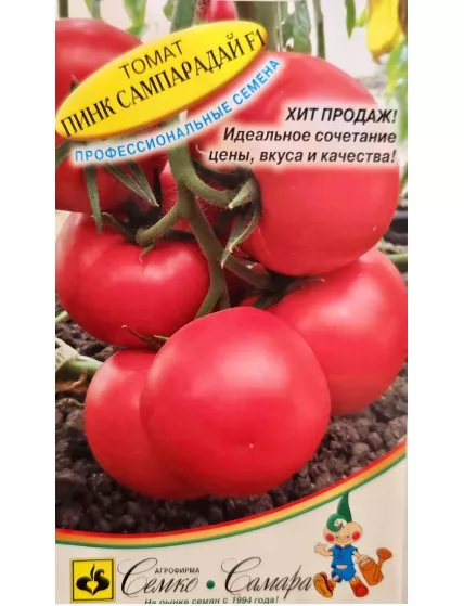 Среднеранний индетерминантный гибрид томата для закрытого и открытого грунта с подвязкой на шпалеру. Растение мощное, среднеоблиственное, стрессоустойчивое. Плоды плоскоокруглой формы, средней плотности, яркого малинового-розового цвета. Число гнезд более 6. Масса плода 200- 250 гр. Вкус отличный. Рекомендован для свежего потребления, приготовления различных закусок, салатов. Томат Пинк Сампарадай F1-настоящий конкурент томату Пинк Парадайз F1, который прочно занимает лидирующие позиции многие годы! Он более стабильно завязывает плоды, устойчив к растрескиванию, вершинной гнили и нематоде, имеет более тонкую кожицу. Максимальной массы плодов можно добиться с помощью прищипывания точки роста главного стебля после 4-5-6 кисти (выращивая в один стебель), а также отличные результаты по урожайности получаются при оставлении одного пасынка и выращивания 5 кистей.