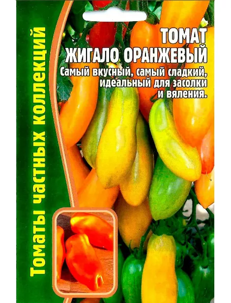 Среднеспелый (90-105 дней от всходов до плодоношения). Детерминантный (40-45 см) сорт, который порадует вас обилием уникальных по форме томатов. Урожайность этого сорта вдвое больше чем у других томатов. Форма плода сильно-вытянуто-цилиндрическая — длина плода 12-15 см, диаметр 34 см.. оранжевого цвета массой 120-140 г. Жигало прекрасно подходит для консервирования в салаты можно резать кружочками замечательный сорт для фаршировки и приготовления аджики. Плоды очень мясистые, семечек совсем мало кожица плотная. При перевозке не мнутся. Хорошо хранятся даже без холодильника. Нет каких-то особенных секретов по выращиванию сорта Жигало. При разведении томатов применяются рассадный и безрассадный способы. Посадка семян в открытый грунт. При такой технологии выращивания томатов сначала проводят проращивание семян. Таким образом можно добиться более раннего прорастания сеянцев томатов сорта Жигало. Для проращивания семян их кладут в полотняный мешочек и примерно на 12 часов опускают в теплую воду. Чтобы семена не остывали, воду периодически меняют. Проращенные семена по две штуки закапывают в лунках, выкопанных на специально подготовленном участке. Семена взяты из частной коллекции Лидии Ишимцевой, выращены на Уральской земле, без применения химикатов и собранные вручную с любовью. Семена сохраняют хорошую всхожесть 5-6 лет.