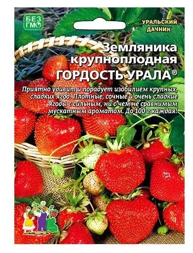 Земляника Гордость Урала – это среднепоздний сорт, который в зависимости от региона начинает плодоносить в середине или конце июля. Кусты мощные, высотой до 30-40 см, с крупными светло-зелеными листьями. Для получения максимального урожая рекомендуется сажать кусты на расстоянии не менее 50 см друг от друга. Ягоды крупные, весом до 150 г в первый год плодоношения, и до 80 г впоследствии. Они имеют темно-красный цвет с оттенками багрянца или терракота и разнообразную форму – от округлой до продолговатой. Урожайность составляет до 1,5 кг ягод с куста.