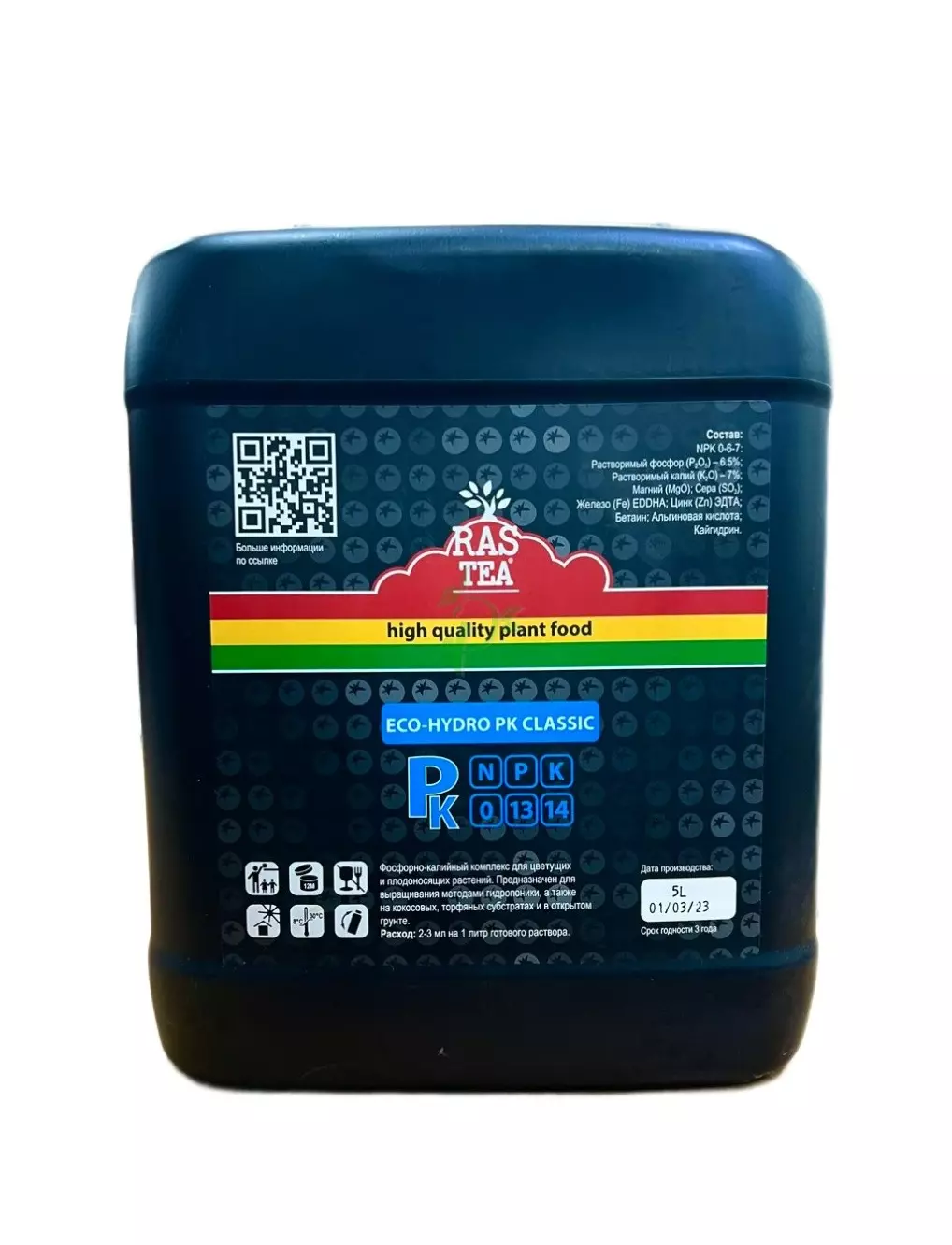 ECO-Hydro PK CLASSIC - органоминеральное удобрение, добавка для цветения-плодоношения. В сочетании с компонентами линейки RasTea ECO-Hydro, обеспечивает оптимальное и полноценное развитие растений в период цветения. В состав концентрированной формулы входит более 40 высококачественных органических и минеральных соединений, способствующих увеличению плотности и размеров соцветий, улучшению вкусовых качеств плодов и лекарственных свойств растений. Способ применения Eco-Hydro PK Classic: 20-30 мл удобрения на 10 л воды. Перед использованием - встряхивать. Бутылки имеют контроль вскрытия. Хранить в недоступном для детей месте. При попадании на кожу - смыть теплой водой с мылом. Eco-Hydro PK Classic содержит более 40 высококачественных элементов, в том числе: содержание не менее P205 - 13%, K20 - 14%, MgO - 3%, SiO - 2.5%. Присутствуют: аминокислоты, бетаин, цитокинины, альгиновая кислота, кайгидрин, фитогормоны, растительные экстракты из вытяжек цветов и трав.