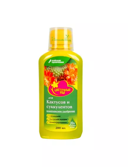 Удобрение для кактусов и суккулентов — это комплексная жидкая подкормка из серии «Цветочный рай», которая способствует здоровому росту и развитию растений. «Цветочный рай» содержит сбалансированный комплекс микроэлементов, таких как железо (Fe), марганец (Mn), цинк (Zn) и медь (Cu), а также бор (B) и молибден (Mo). Эти элементы обеспечивают здоровый рост и развитие растений, стимулируют образование побегов, сочной зелени и обильное цветение. Также подкормка устраняет видимые признаки недостатка питательных веществ и предотвращает болезни, вызванные их дефицитом.
