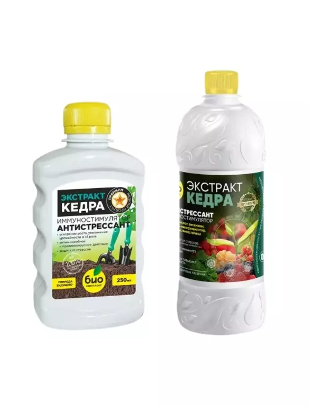 Водный экстракт кедра сибирского — универсальное удобрение с антибактериальными свойствами, которое служит стимулятором роста и развития растений. Оно содержит эфирные масла, витамины и микроэлементы, улучшающие обмен веществ и защищающие от инфекционных и грибковых заболеваний, а также стрессовых факторов. В результате применения удобрения растения становятся здоровыми, увеличивается урожайность, плоды приобретают насыщенный вкус и аромат, а их сохранность улучшается.