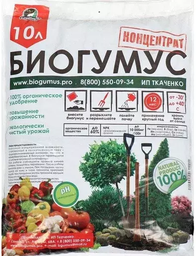 Биогумус - удобрение с множеством полезных элементов, которые улучшают структуру почвы и стимулируют рост и плодоносность растений. Это также и микробиологическое удобрение, в нем есть микроорганизмы, создающие почвенное плодородие. Удобрение легко и постепенно усваивается растениями в течение всего цикла своего развития. Биогумус в 10-15 раз эффективнее любых известных органических удобрений и совершенно безвреден на любых почвах. Наблюдается повышение урожайности на 30-50%! Может использоваться как самостоятельный грунт.