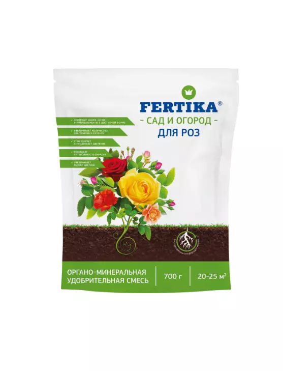 «Фертика для Роз» — это органо-минеральная удобрительная смесь с 18% содержанием гумата. Она предназначена для основного внесения и подкормки роз, а также других цветочно-декоративных культур, оранжерейных, комнатных и балконных цветов. Каждая гранула смеси содержит полный набор макро- и микроэлементов, необходимых для нормального роста и развития растений.