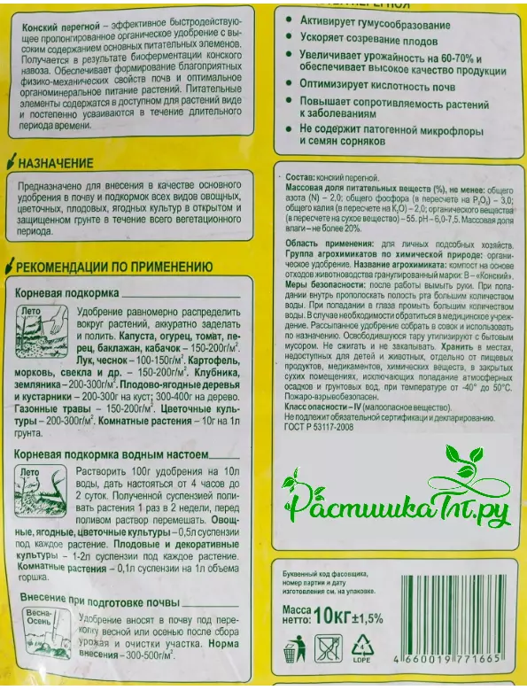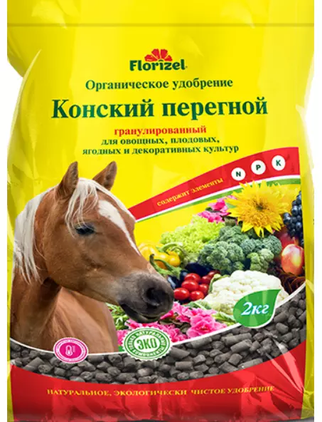 Конский перегной - кладезь основных питательных элементов. Это органическое удобрение с пролонгированным действием. Микроэлементы доступны для растений и усваиваются постепенно, в течение длительного времени. Быстродействующее органическое удобрение, которое содержит необходимый растениям набор питательных веществ. Подходит для всех видов культур. Используется исключительно для открытого грунта и теплиц.