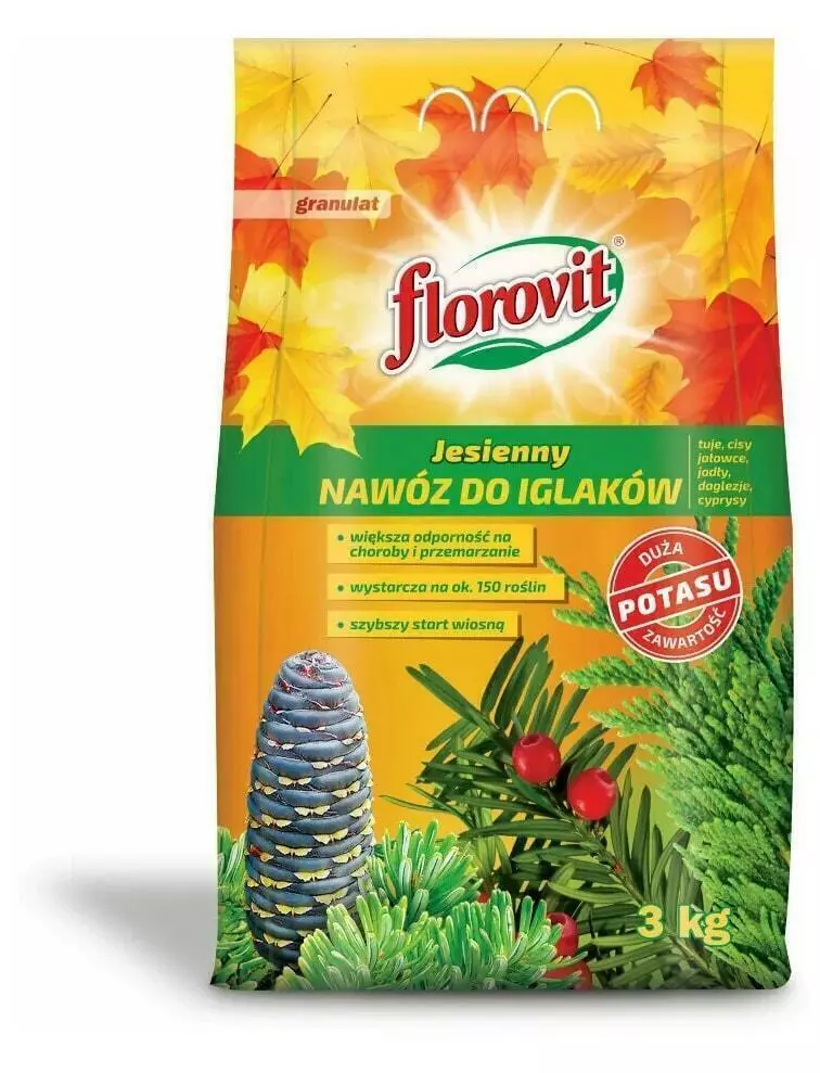 Тщательно подобранные питательные компоненты удобрения способствуют одеревенению, что оберегает хвойные растения от замерзания.