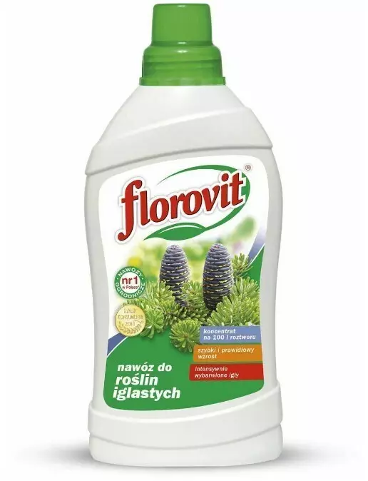 Удобрение "Флоровит" для хвойных, 1 л. Концентрированное удобрение для хвойных растений предназначенное для грунтовой подкормки хвойных деревьев и кустарников. Систематическое использование удобрения обеспечивает интенсивный рост и красивый цвет хвои растений. Способ применения: Молодые растения (до 2 лет): поливать 1-2% раствором препарата - 10-20 мл удобрения растворить в 1 литре воды. Взрослые растения: поливать 2-3% раствором препарата - 20-30 мл удобрения растворить в 1 литре воды.