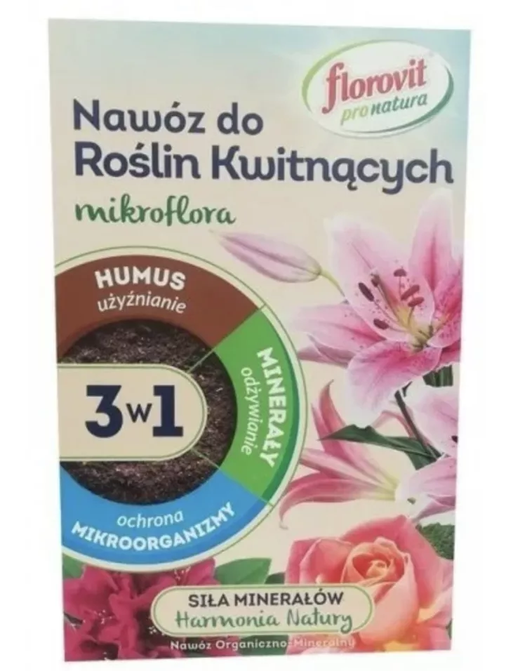 Удобрение Florovit (Флоровит) для цветущих богато гумусовыми соединениями, очень похожими на гумус, содержащийся в компосте или навозе. Если удобрение используется систематически, оно естественным образом восстанавливает правильную структуру субстрата. Средство для цветущих растений можно использовать для всех типов почв.Удобрение подходит для: будлеи, форзиции, глицинии, гортензии, жасмина, калины, кустарниковой лилии, магнолии, смородины, клематисов, роз, тавулы, гераньи, анютиных глазок, георгин, фиалки, флокс, гвоздики, лаванды, лилии, чабреца, пиона, гераньи.Подкормка также содержит гуминовые вещества, которые способствуют лучшему росту и развитию корней растений и эффективному усвоению питательных веществ из почвы.Микрофлора является комплексным удобрением-содержит все ингредиенты, необходимые для правильного роста и развития растений.