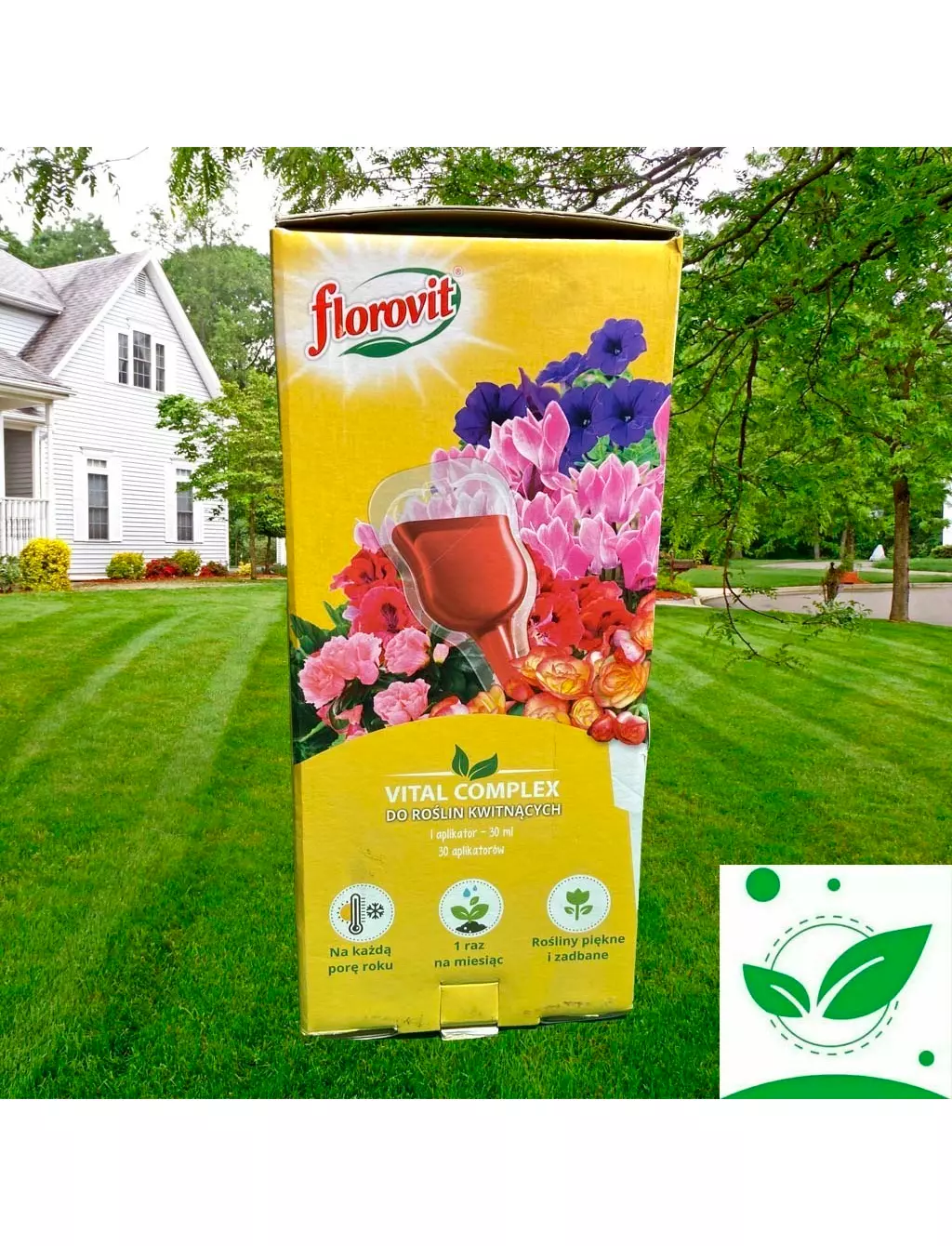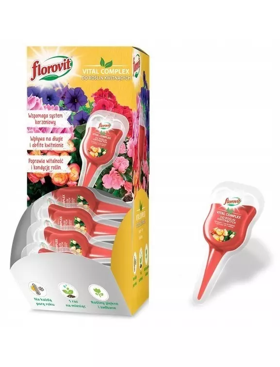 Комплекс Florovit Vital - это современная и готовая к использованию система для всех видов цветущих растений. Специально разработанный комплекс укрепляющих веществ улучшает жизнеспособность и состояние растений, поддерживает корневую систему и влияет на длительное и обильное цветение. Регулярное использование улучшает состояние почвы и положительно влияет на естественную устойчивость растений. Способ применения: Отрежьте наконечник на месте разреза и поместите сопло аппликатора в основание так, чтобы образец свободно вытекал. Время опорожнения зависит от качества и влажности субстрата. Vital Complex можно использовать в течение всего года. Используйте один раз в месяц, 1 аппликатор на 1 растение. Не забывайте регулярно поливать растения.