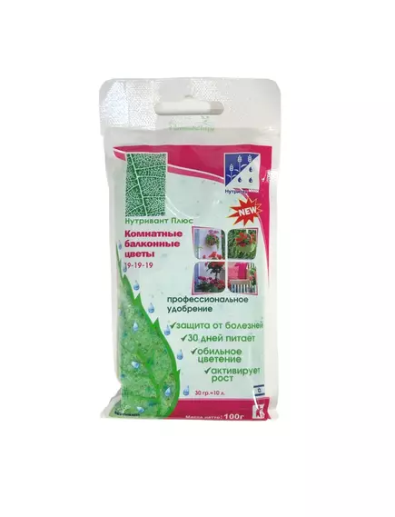 Высокоэффективное профессиональное водорастворимое удобрение для листовых подкормок Нутривант плюс Комнатные и балконные цветы.Азотосодержащее фосфорно-калийное удобрение с микроэлементами и уникальным прилипателем Фертивант +.Назначение: для листовой подкормки всех контейнерных ампельных и горшечных растений.Действие:Восполняет недостаток макро- и микроэлементов;Удерживает питательные вещества на листе до 30 дней;Повышает устойчивость к различным заболеваниям и стрессам;Смягчает "жесткую" воду нормализует pH;Стимулирует закладку сильных цветковых почек активизирует цветение.Массовая доля питательных веществ:Азот общий 19%;Фосфор водорастворимый (P2O5) 19%;Калий (K2O) 19%;Магний (MgO) 2%;Сера (SO3) 1.6%;Бор (B) 0.01%;Железо (Fe) 0.08%;Марганец (Mn) 004%;Цинк (Zn) 002%;Медь (Сu) 0005%;Молибден (Mo) 0.005%Прилипатель Фертивант +.1%-й водный раствор образует стойкий гомогенный раствор. Плотность слеживания г/мл 125. Кислотность (рН 1% раствора) 41 - 42. Электропроводность ЕС мС/см 063 - 068. Максимальная растворимость в воде t = 20°С г/100 мл 365.Способ приготовления рабочего раствора: растворить 30г в 10л воды (03% раствор).Способ применения:Рекомендуется двукратная листовая обработка:- в фазу рассады/саженца;- в фазу бутонизации.Производитель: ICL Fertilizers Израиль. Мелкая фасовка: ООО Нутритех мини Россия.