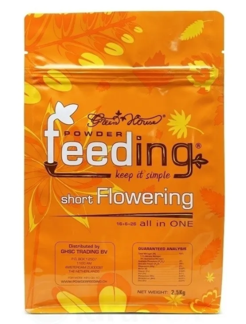 Минеральное удобрение Powder Feeding Short Flowering специально разработано для растений с коротким периодом цветения (менее 8 недель). На ранних стадиях цветения эти растения имеют необходимость в большем количестве быстро доступного калия, что обеспечивает бурное цветение и большую массу плодов за более короткий промежуток времени.