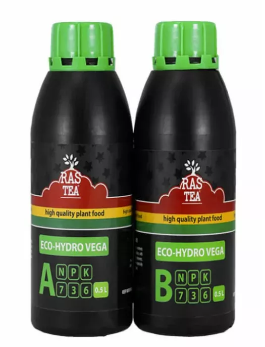 RasTea ECO-Hydro VEGA A/B - базовое органо-минеральное удобрение, но для раскрытия всего потенциала растения используется в сочетании со стимуляторами. Концентрированная формула содержит фульвокислоты и аминокислоты, которые способствуют развитию полезных микроорганизмов. Питательные элементы в доступной форме обеспечивают быстрый старт, здоровый рост и мощную иммунную систему. Гарантирует стабильный набор зеленой массы. Способ применения ECO-Hydro VEGA: Кокосовый сусбтрат, гидропоника - 40 мл удобрения на 10 л воды. Почвенные смеси - 20 мл удобрения на 10 л воды. Внимание: Компоненты A и B добавлять в равных количествах. Компоненты A и B в концентрированном виде не смешивать. Перед использованием - встряхивать. Бутылки имеют контроль вскрытия. Хранить в недоступном для детей месте. При попадании на кожу - смыть теплой водой с мылом. В комплект входит 2 бутылки. Eco-Hydro содержит более 40 высококачественных элементов, в том числе: N общий - 7% (Нитратный - 3.5% , Аммиачный - 2% , Амидный - 1.5%), P205 - 3%, K20 - 6%, MgO - 0.5%, CaO - 1%, SO3 - 2.5%, B - 0.02%, Fe(общий) - 0.12%, Cu - 0.015%, Mn - 0,.05%, Zn - 0.02%, Mo - 0.005%. Присутствуют: аминокислоты, бетаин, цитокинины, альгиновая кислота, кайгидрин, фитогормоны, растительные экстракты из вытяжек цветов и трав.