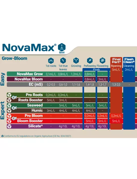 Удобрение GHE NovaMax Bloom сильно концентрировано: максимальная дозировка не должна превышать 2.5мл/л.